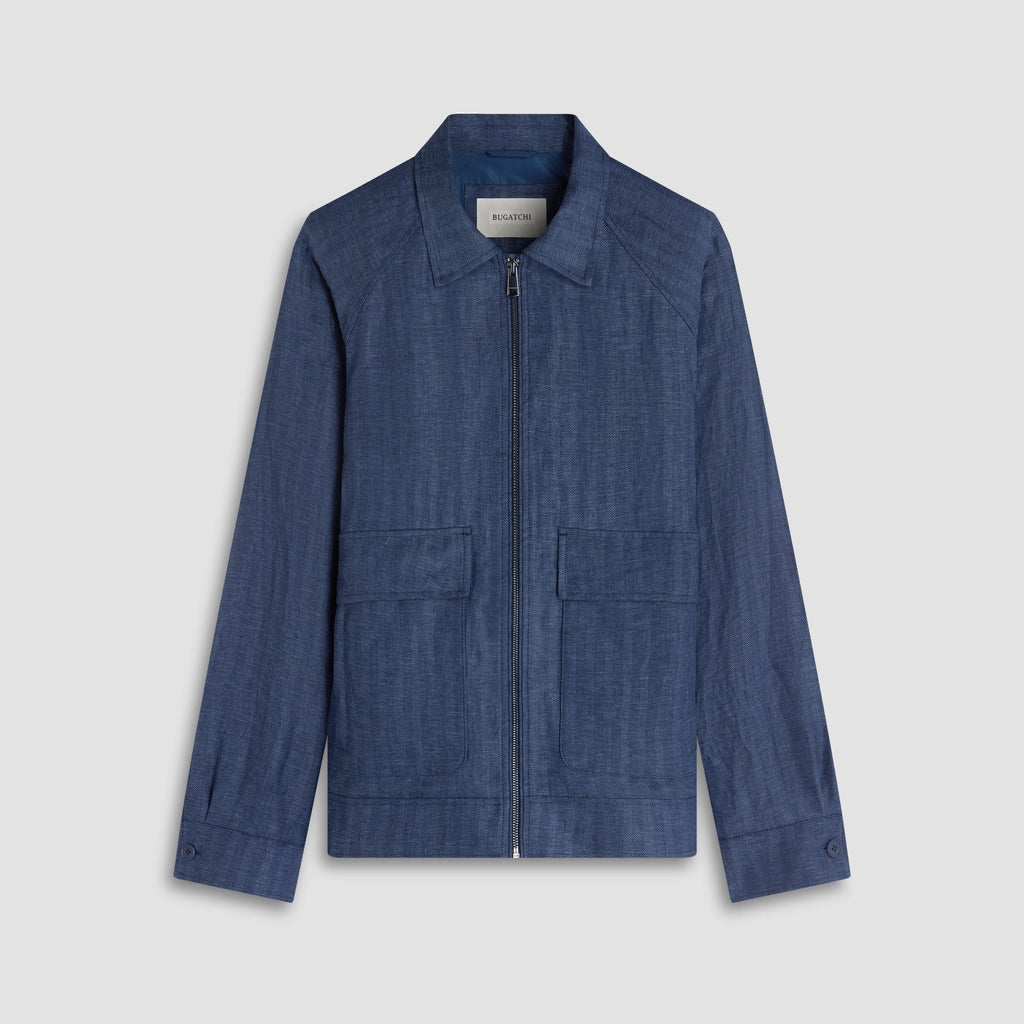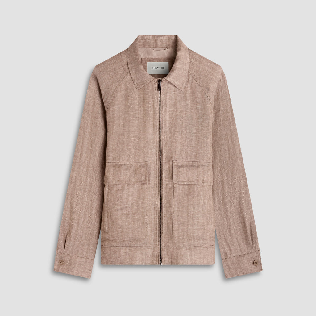 This full-zip linen bomber jacket combines refined craftsmanship with understated sophistication. Constructed from 100% linen in a distinctive herringbone weave, it features a sharp point collar, smooth full zipper, and precisely buttoned cuffs. The thoughtfully designed pocket system includes patch-and-flap styles with hidden snaps, side-entry pockets with concealed zippers, and an interior patch pocket for practical storage. Complete with full lining for structure and drape, this versatile layer transcends seasonal trends, offering the kind of timeless elegance that anchors any wardrobe.