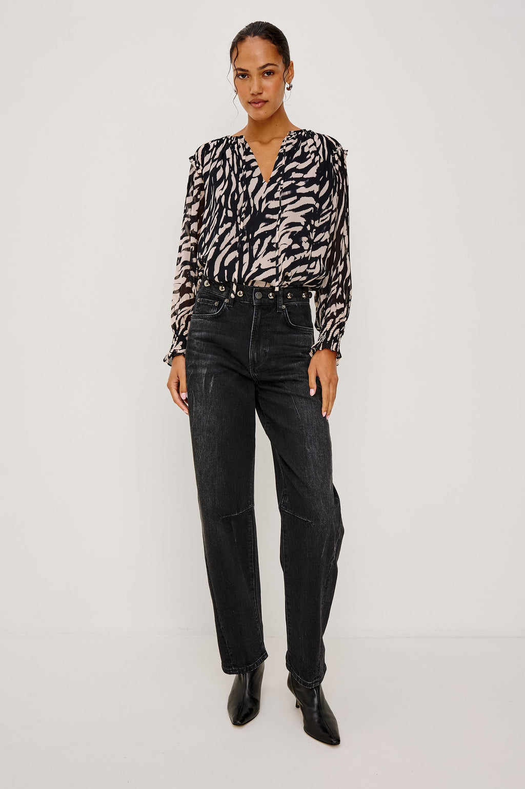 The Mirna commands attention with its striking abstract animal print rendered across luxurious chiffon. This statement piece features a flattering V-neckline accented with self-tie details, while the boxy silhouette offers contemporary ease and movement. Sheer long sleeves finished with smocked cuffs add refined texture and dimension. Perfect for those who refuse to blend in, the Mirna transforms any occasion into an opportunity to showcase bold, artistic style.