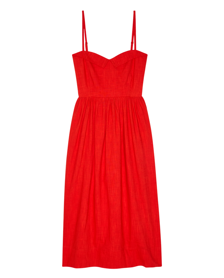 Inspired by 1940s silhouettes, The Verse Dress captures vintage romance with a sweetheart neckline finished in a delicate folded edge. Crafted from breathable, textured cotton, this piece features structured side boning that sculpts the torso while strategic smocking at the back ensures unrestricted movement. Adjustable shoulder straps and a cinched waist seam define the figure before flowing into a graceful calf-length skirt with an effortlessly feminine drape. A masterclass in nostalgic design meeting modern comfort.