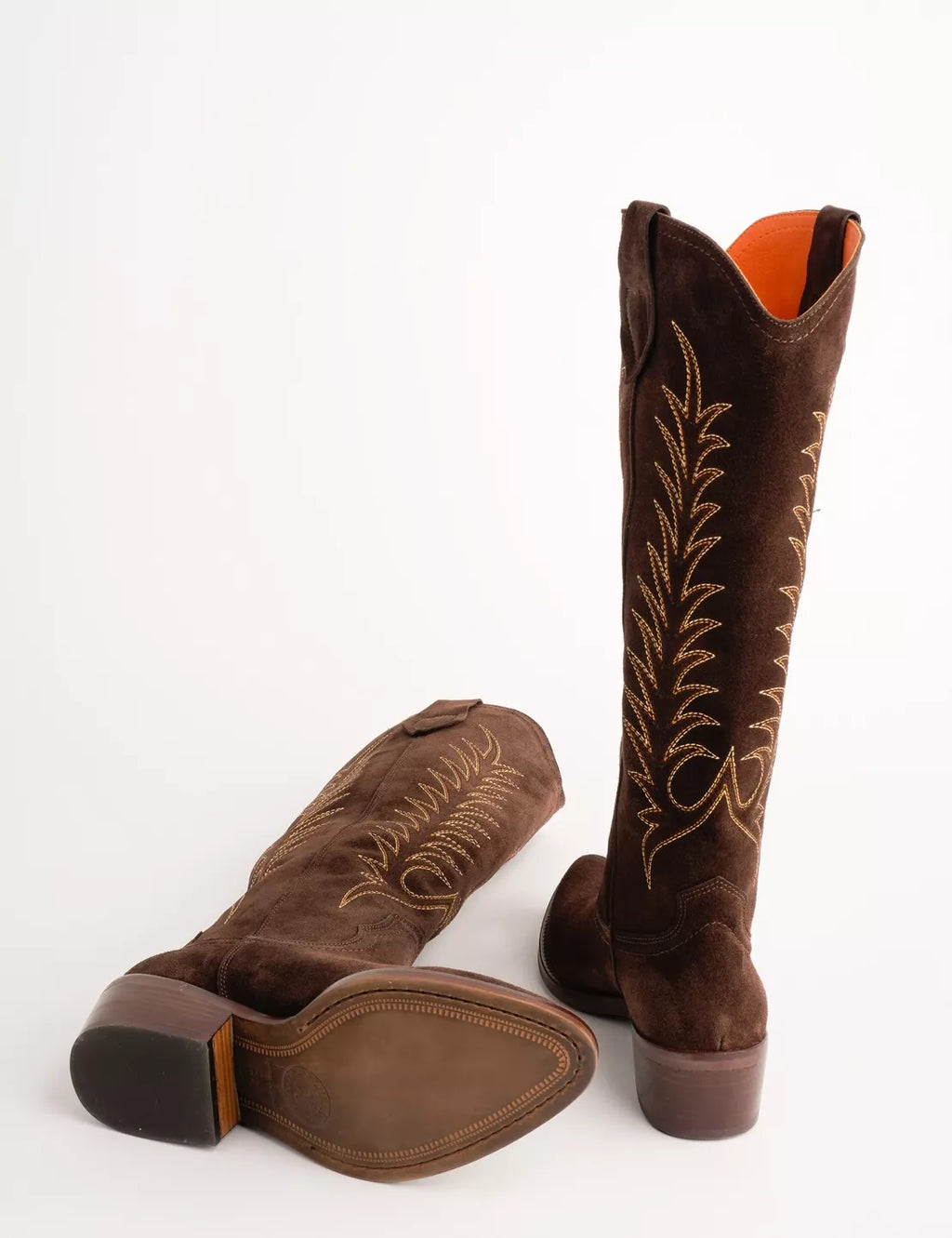 The Blanca Suede Embroidered Boot showcases a refined silhouette with its elongated shaft and Cuban heel, complemented by distinctive feather-motif Western embroidery. Crafted from premium chocolate brown suede certified by the Leather Working Group, this autumn-winter addition combines timeless cowboy aesthetics with contemporary elegance. Handcrafted in Spain, each pair reflects meticulous attention to detail and sustainable sourcing practices, making it a sophisticated choice for those seeking quality footwear with character.