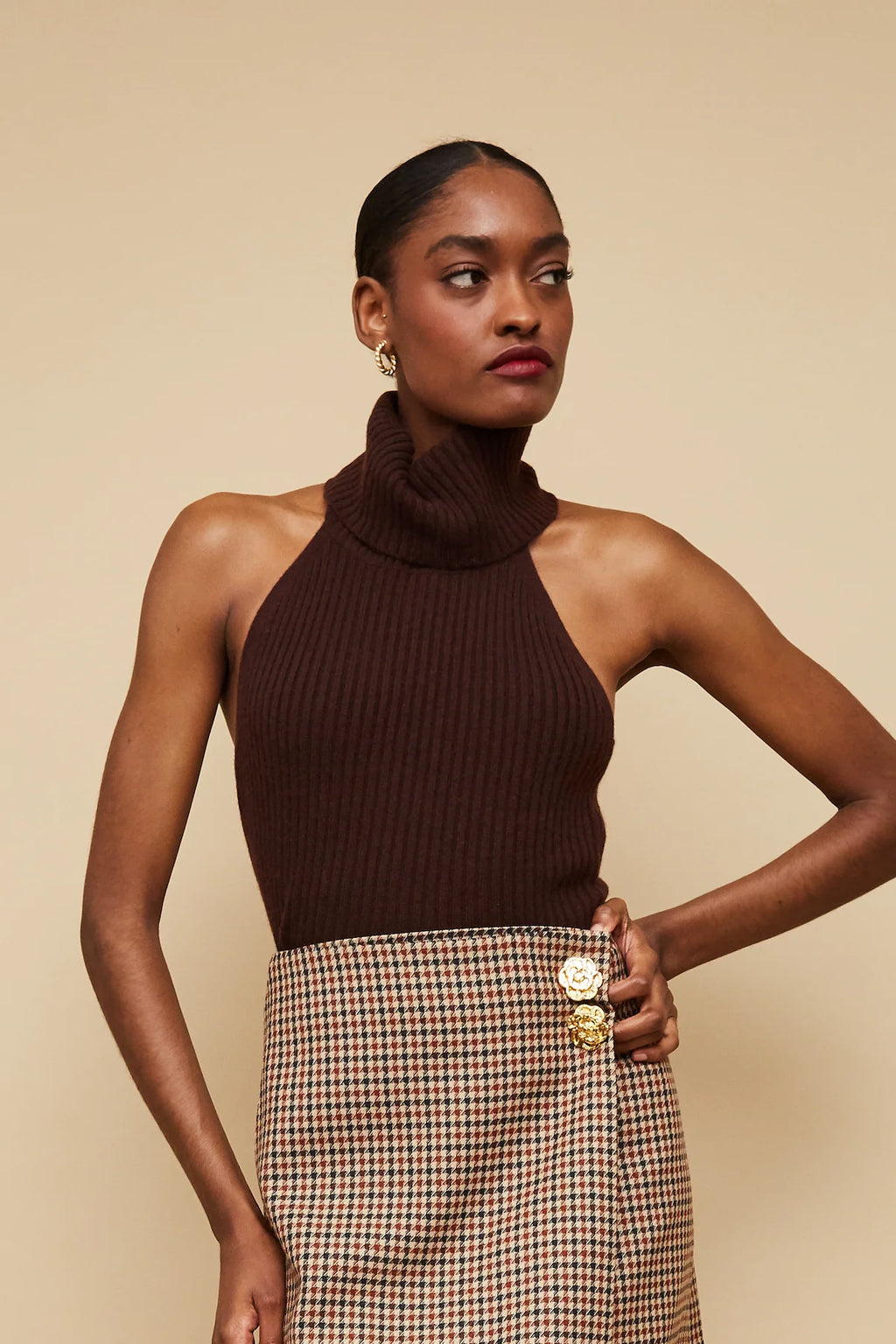The Samson Top combines contemporary design with refined construction. This form-fitting piece features a luxurious ribbed knit fabric with a distinctive open back halter neckline and oversized turtleneck collar. The vertical rib stitch creates a sophisticated, figure-flattering silhouette that moves with your body. Perfect for layering or wearing as a statement piece, this versatile top transitions seamlessly from day to evening wear. A modern essential for those who appreciate quality craftsmanship and thoughtful design details.