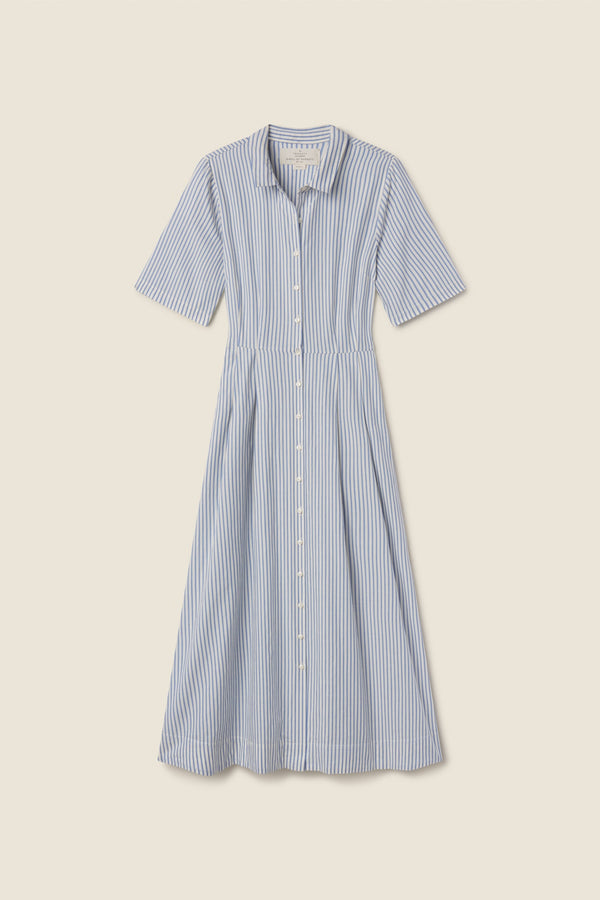 Embrace timeless elegance with the Aster Dress, a vintage-inspired shirt dress designed for effortless sophistication. The cinched pleated waist creates a flattering silhouette, while the full-button front and midi hemline offer versatile styling options. Practical details include signature hip pockets and adjustable short sleeves you can cuff to your preference. Crafted from durable coastal cotton twill in a charming Seaside Stripe pattern, this piece transitions seamlessly from day to evening wear.