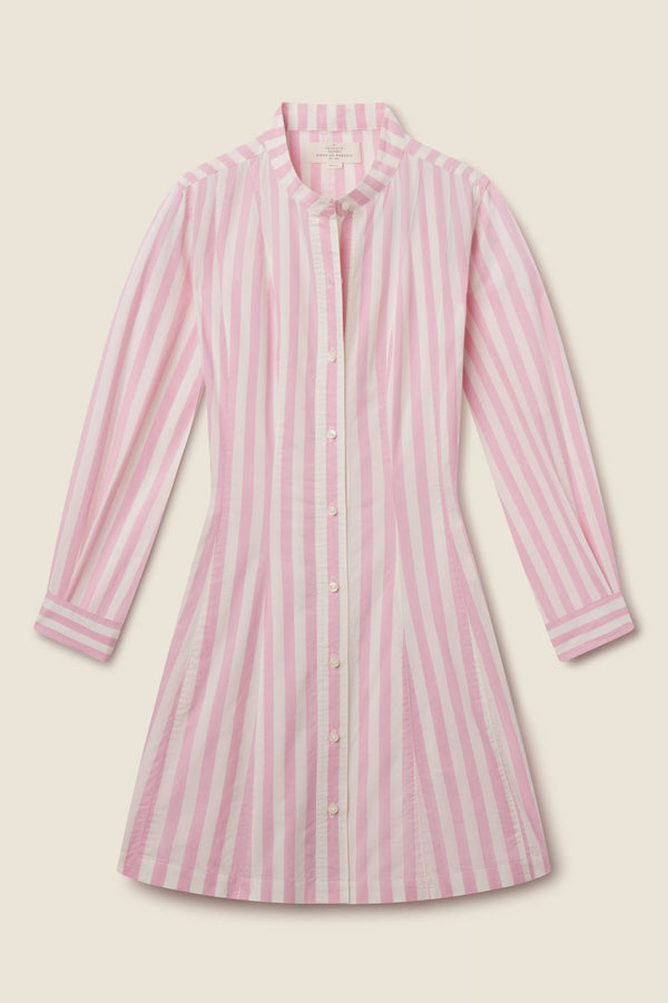 The Marina Dress combines classic tailoring with everyday practicality. This short shirt dress features vertical seams that cinch at the waist before flowing into a flattering flare hem. A full button-front placket, crisp collar, and bracelet-length sleeves deliver timeless style, while hidden side pockets add functional appeal. Crafted from breathable cotton poplin in a charming pink stripe, it's a versatile piece ready for work or weekend wear.