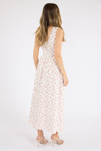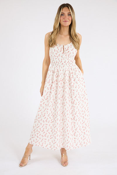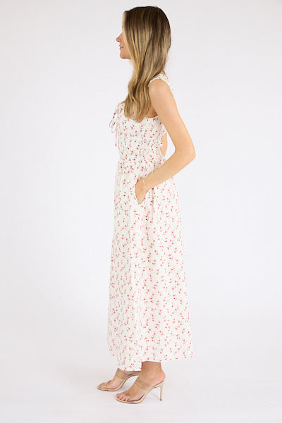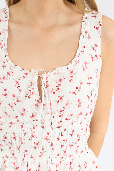 The Jordie dress features a flattering A-line silhouette that skims the body beautifully. A rounded square neckline frames the shoulders, while delicate ruffle trim adds feminine detail throughout. The standout center-front bust cutout with self-tie straps creates an elegant focal point and allows for customizable fit. A smocked waist provides gentle shaping and comfortable wear all day long. Perfect for any occasion where you want to feel polished and put-together.