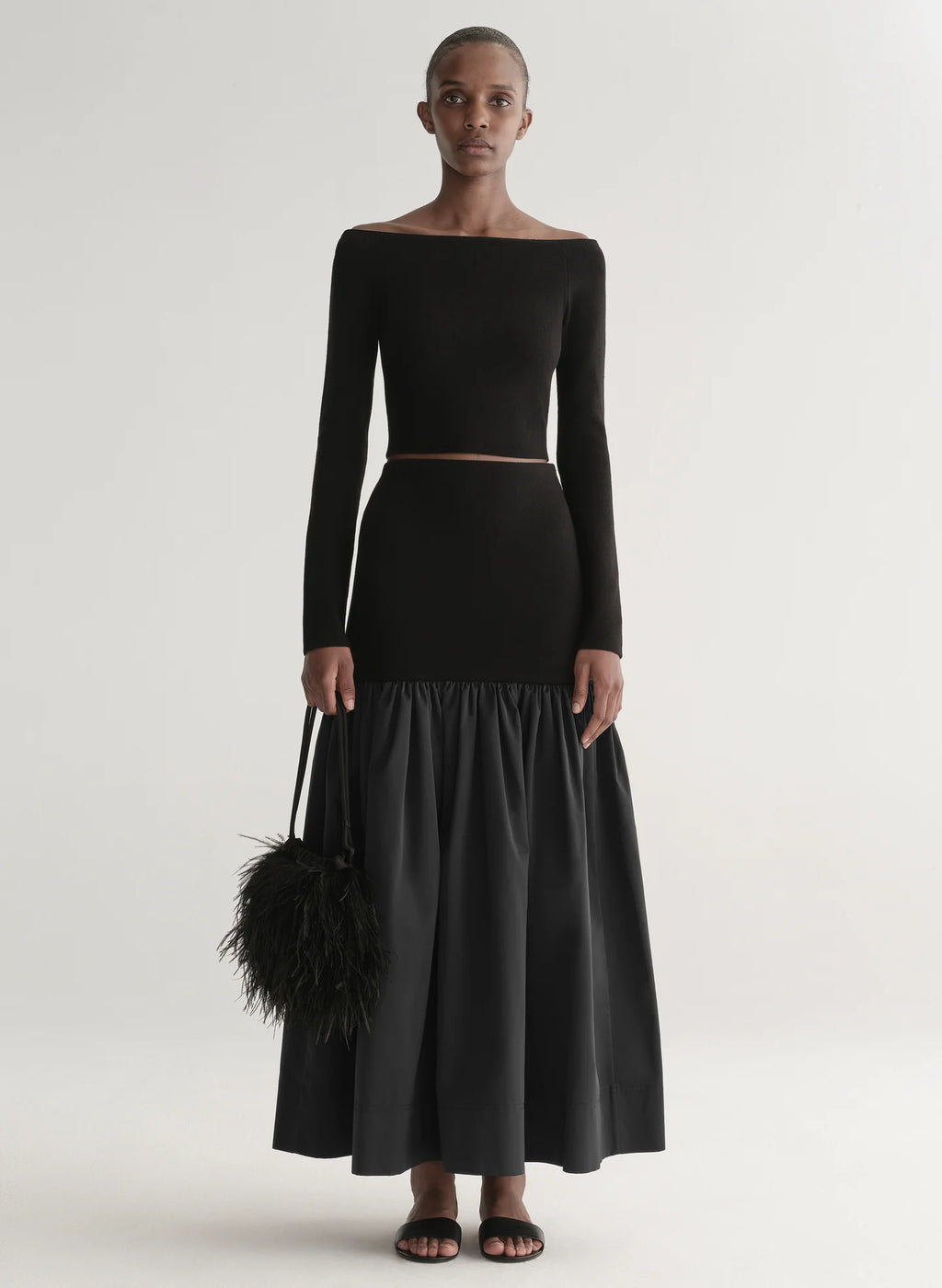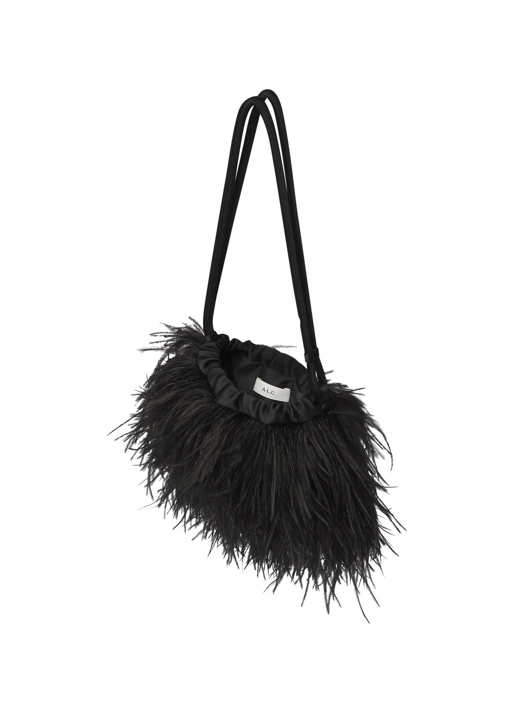 - Crafted from soft black ostrich feathers with satin trim and handles