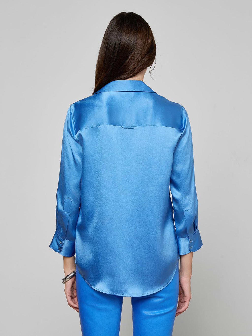 Indulge in luxurious charm with the Dani 3/4 Sleeve Blouse. Made from 100% charmeuse silk, this classic button-down blouse features a light-catching luster that adds an elegant touch to any outfit. The relaxed open collar and three-quarter-length sleeves make it both stylish and comfortable. Perfect for any occasion.