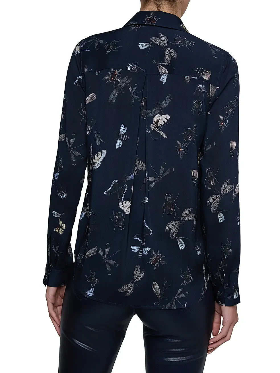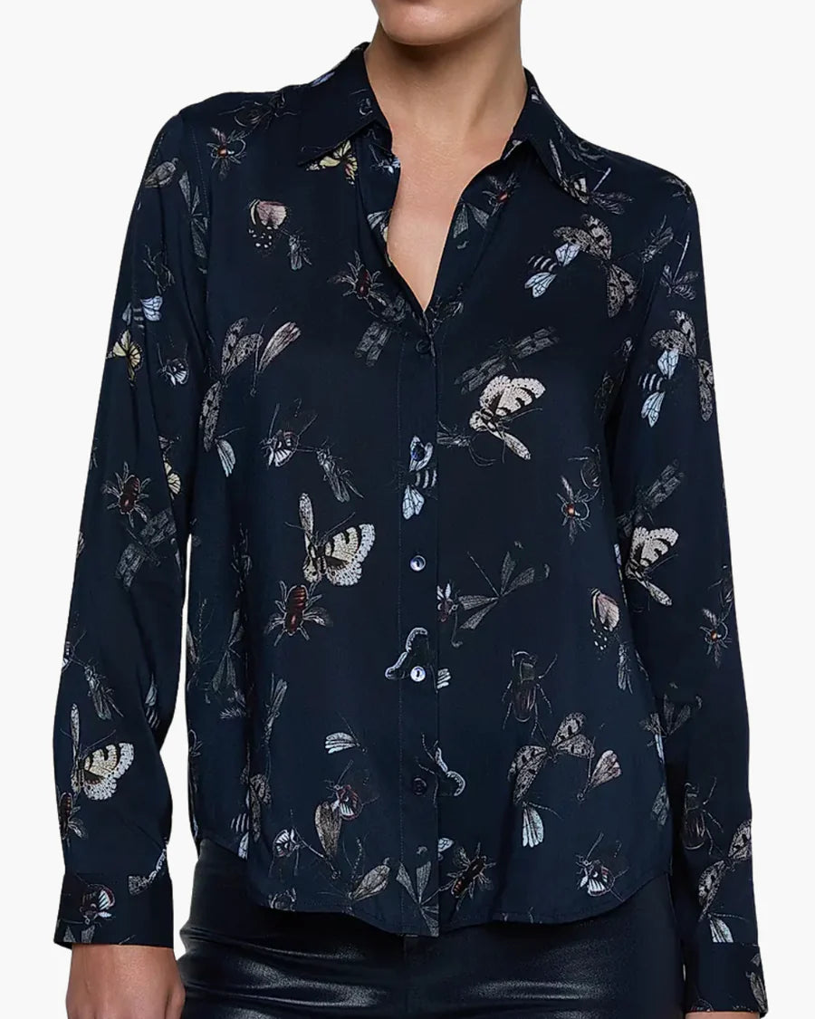 The Holly L/S Blouse by L'AGENCE combines refined tailoring with understated visual interest. This versatile piece features a spread collar, button-front closure, and long sleeves that anchor a timeless silhouette. The butterfly-print design delivers a sophisticated pop of personality without compromising wearability. The fluid drape moves gracefully through your day, making it equally at home paired with tailored trousers, crisp denim, or a polished skirt. An investment piece that transcends seasons and occasions.