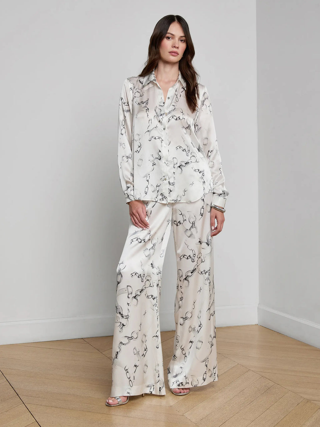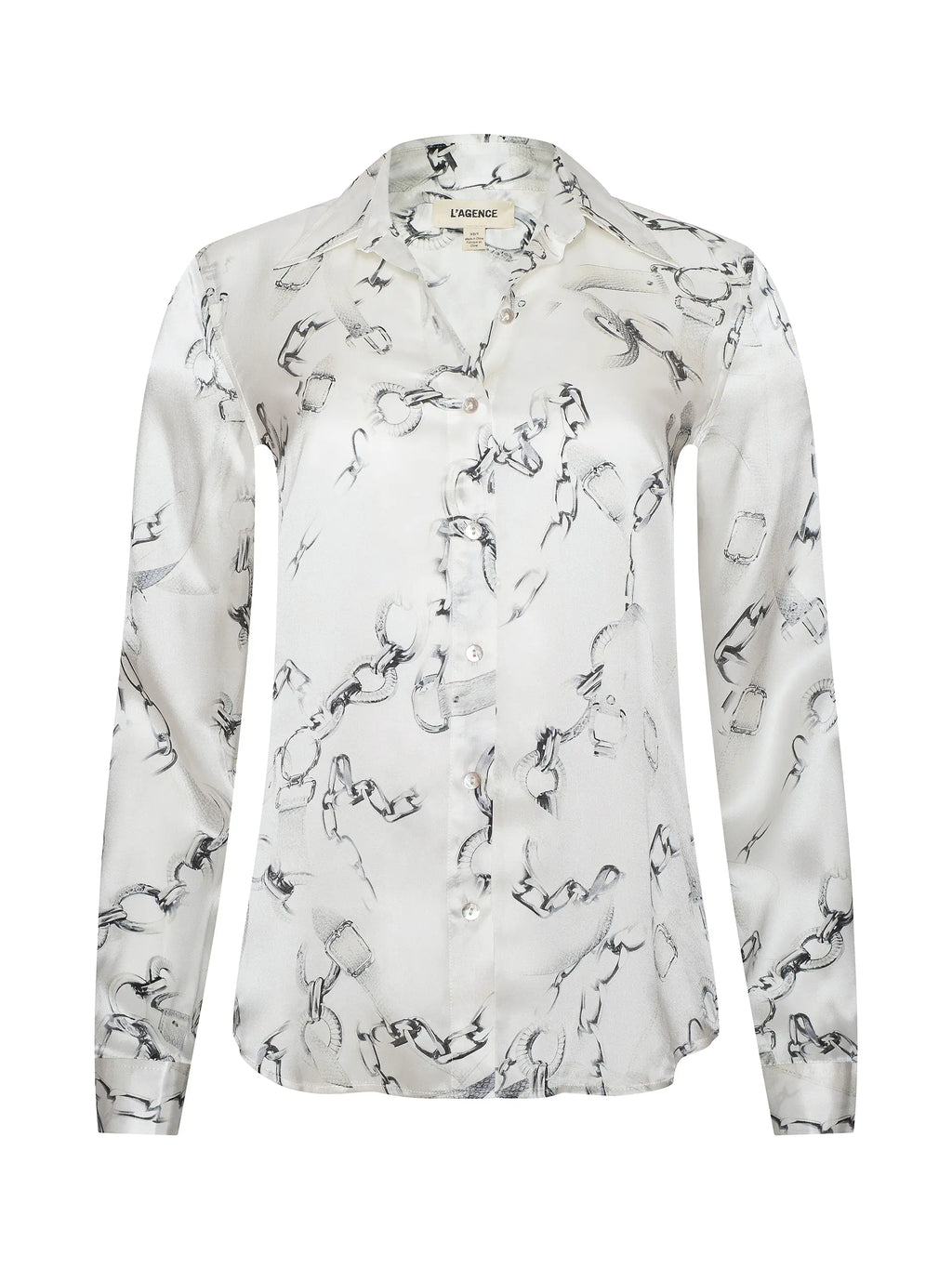 The Tyler L/S Blouse represents refined versatility in silk construction. This L'AGENCE staple features a classic button-down silhouette crafted from luxurious silk, offering a polished foundation for professional and elevated casual styling. The gray chain print delivers sophisticated visual interest while maintaining understated elegance. Long sleeves provide coverage and dimension, making this piece seasonally adaptable. As a perennial bestseller, the Tyler has earned its place as a wardrobe essential—a piece that transitions seamlessly across occasions and coordinates effortlessly with tailored trousers, denim, or layered under structured outerwear.