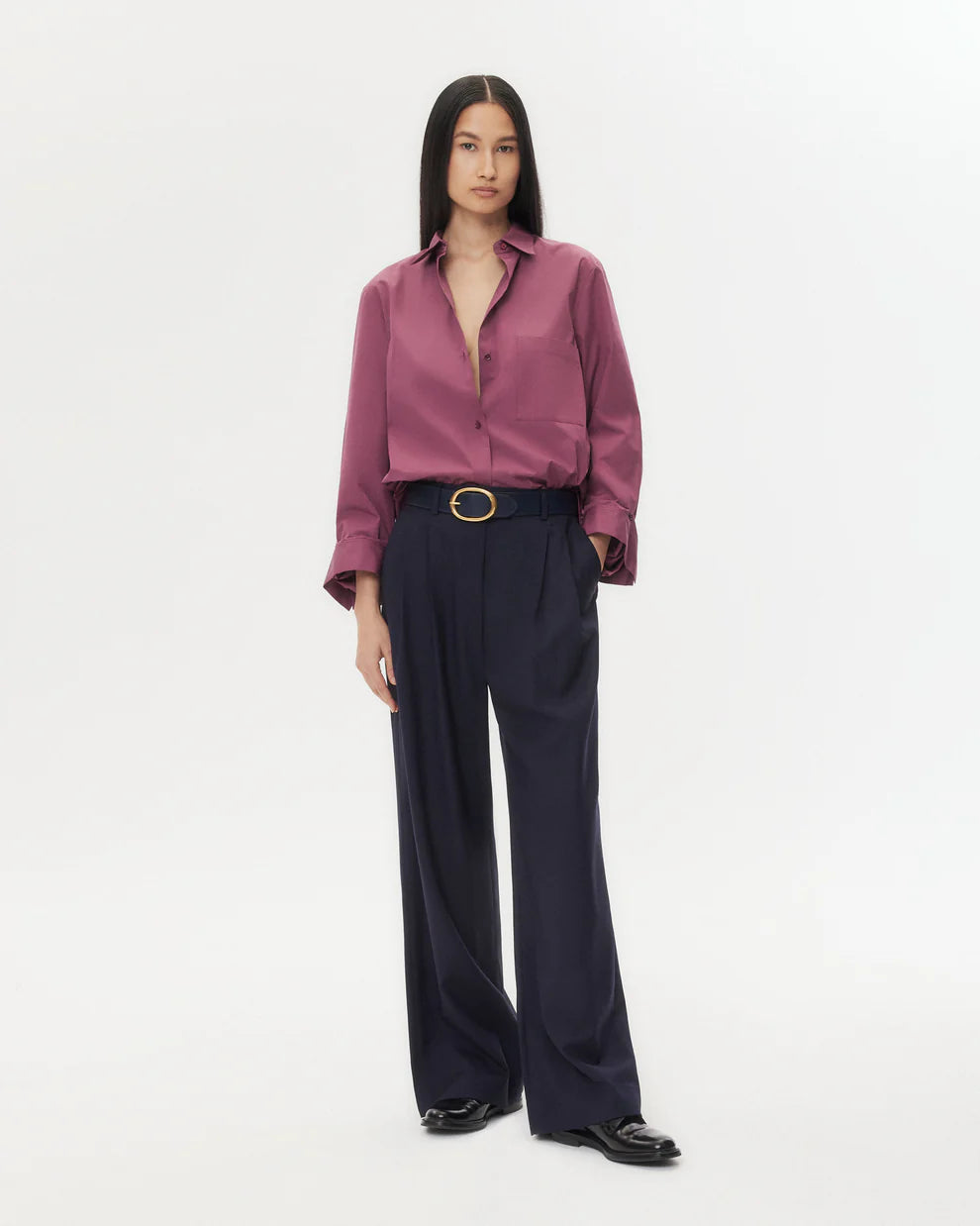 The Next Morning exemplifies understated elegance in an oversized silhouette. Constructed from super compact cotton poplin, this shirt delivers a structured drape with a distinctly crisp hand feel and smooth surface. The relaxed fit is refined by a center back box pleat that enhances movement and visual interest. Thoughtful details include a spread collar for versatile styling, exposed button-up placket, chest patch pocket, and single roll button cuffs. A sophisticated staple that balances comfort with polished sophistication.